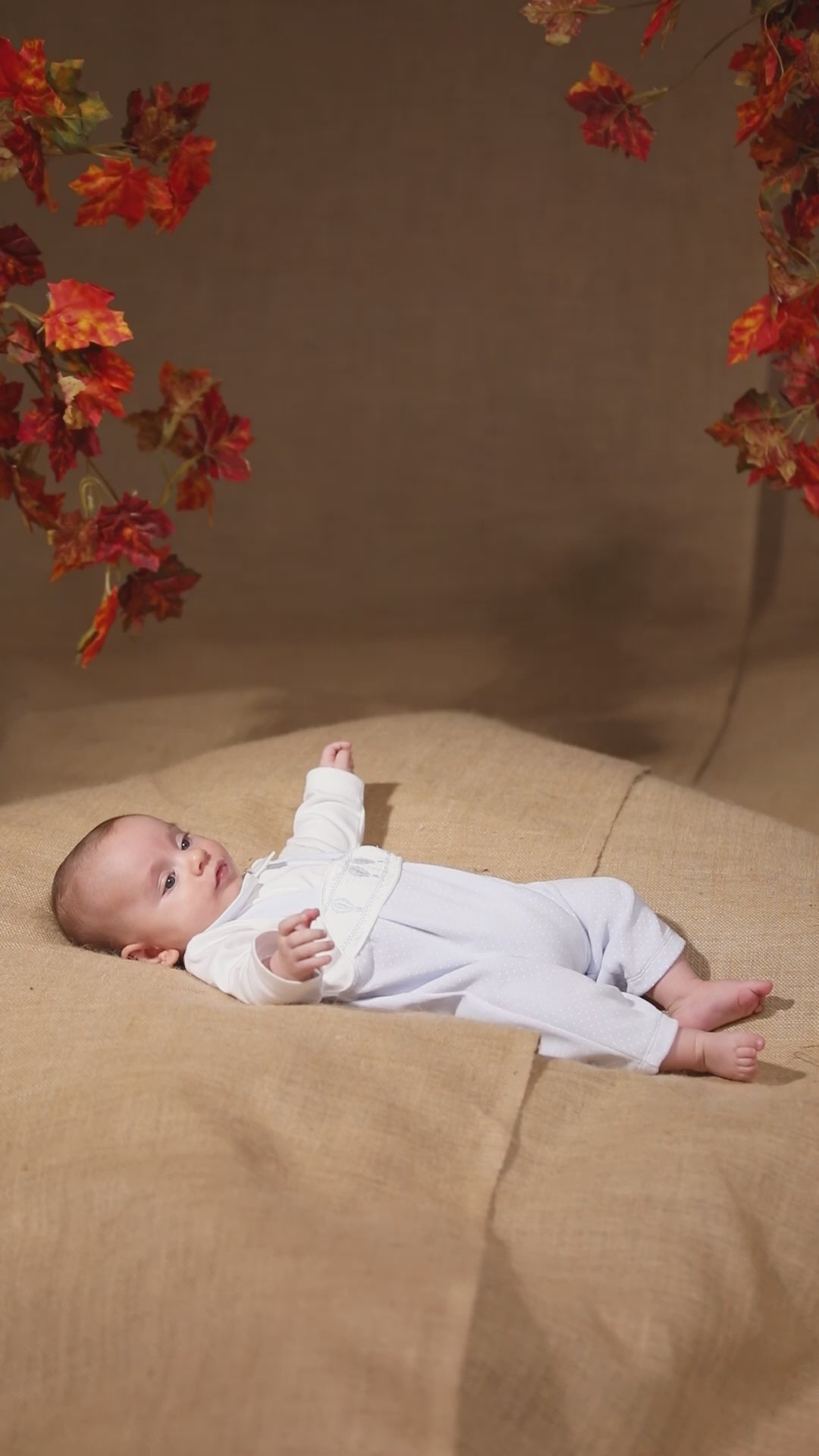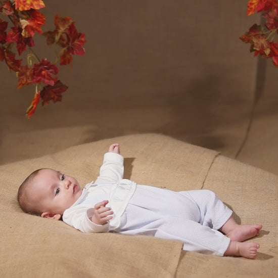 This elegant all-in-one features a velour fabric adorned with a charming polka dot pattern, complemented by intricate air balloon smocking on the chest. Designed with dungaree-style straps, long sleeves, and a smart collar, it offers both comfort and sophistication, perfect for dressing up any occasion.
