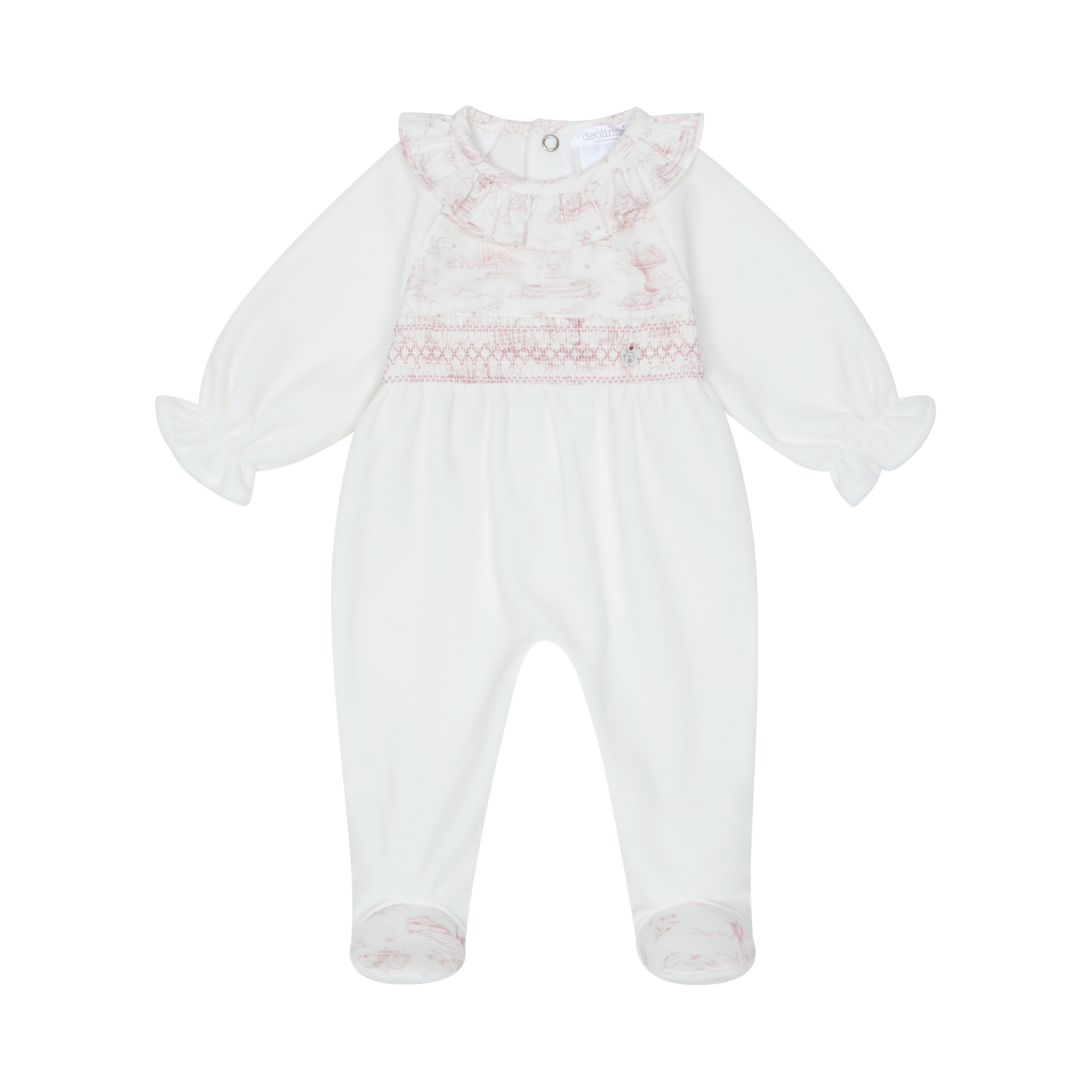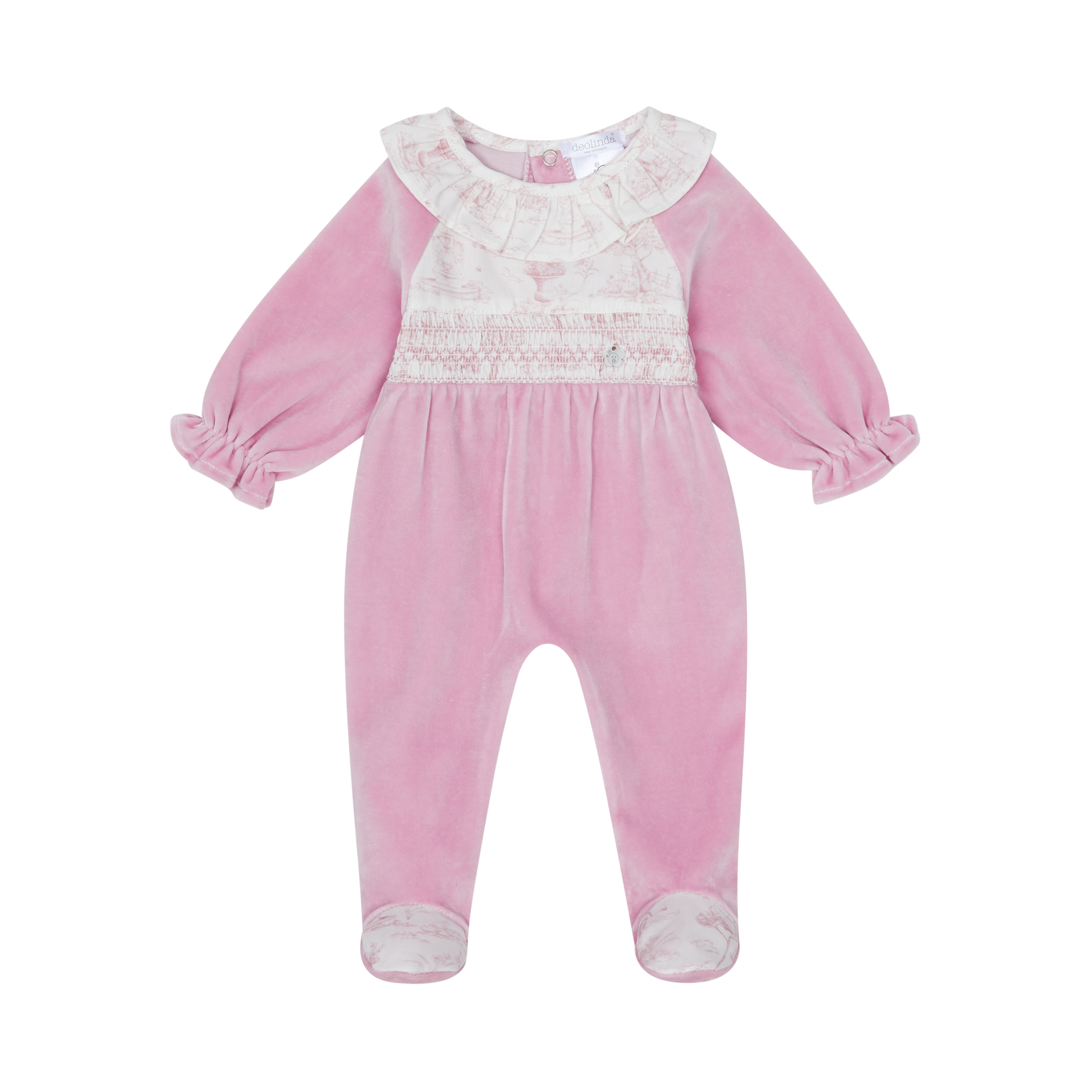 This exquisite pink velour all-in-one features a delicate printed bib area inspired by the classic willow pattern. Expertly designed with smocking detail across the chest, a frill collar, and frill cuffs, it combines elegance with comfort. The covered feet ensure warmth and protection, making it a refined choice for your little one’s wardrobe.