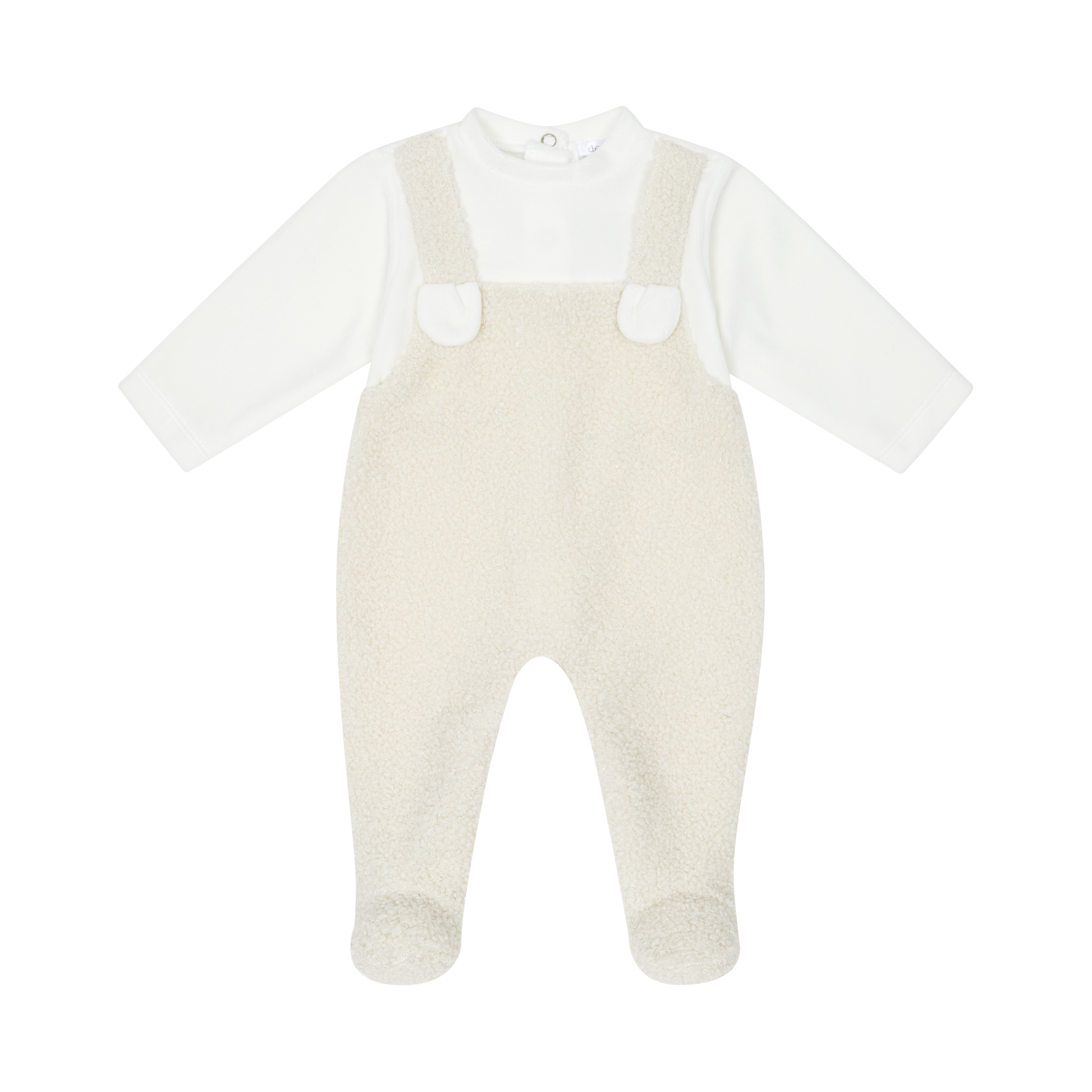 The 25140 Deolinda All in One is a versatile dungaree-style romper featuring a bib and brace design for a secure fit. It includes a mock long-sleeved top with a round collar and back fastening, providing easy dressing and a neat appearance. Covered feet add extra warmth and comfort, making this outfit perfect for keeping little ones cozy throughout the day.