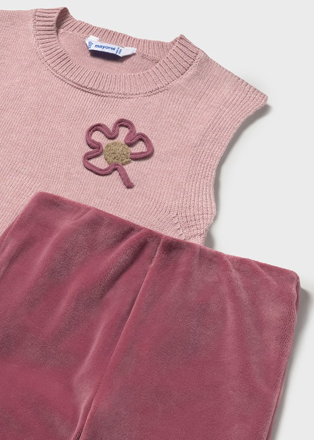 This 3-piece set includes a charming knitted tank top adorned with a delicate applique flower detail, paired with a long-sleeved top featuring a refined collar. Completing the outfit are soft, pull-on velour trousers that combine comfort with elegance, making this ensemble perfect for stylish, everyday wear.