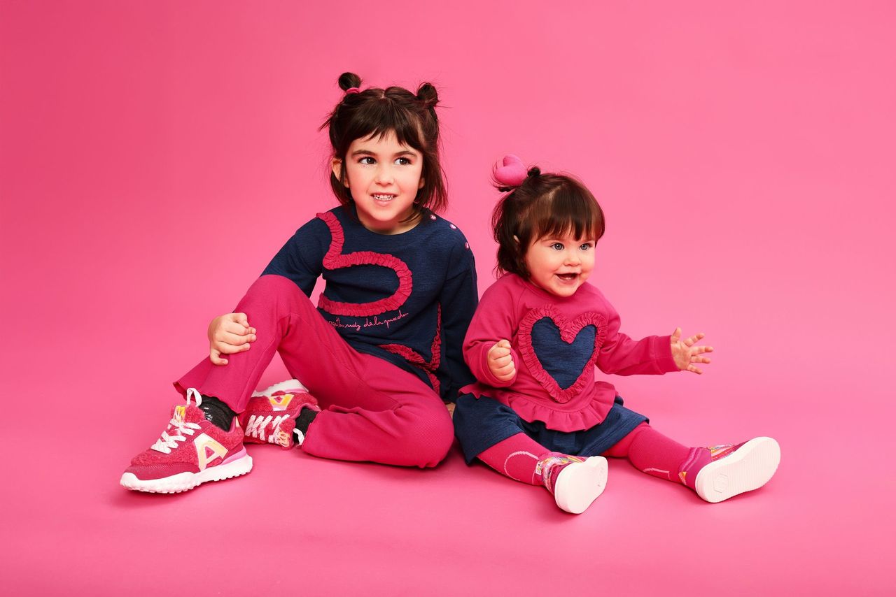 This 2-piece set features a navy sweatshirt adorned with large fuchsia abstract heart appliques, offering a playful yet stylish look. The sweatshirt’s round neck, long sleeves, and longer length ensure comfortable, cozy wear. Paired with soft, pull-on fit and flare leggings in vibrant fuchsia, this ensemble balances comfort with a bold color contrast, perfect for both casual and active days.