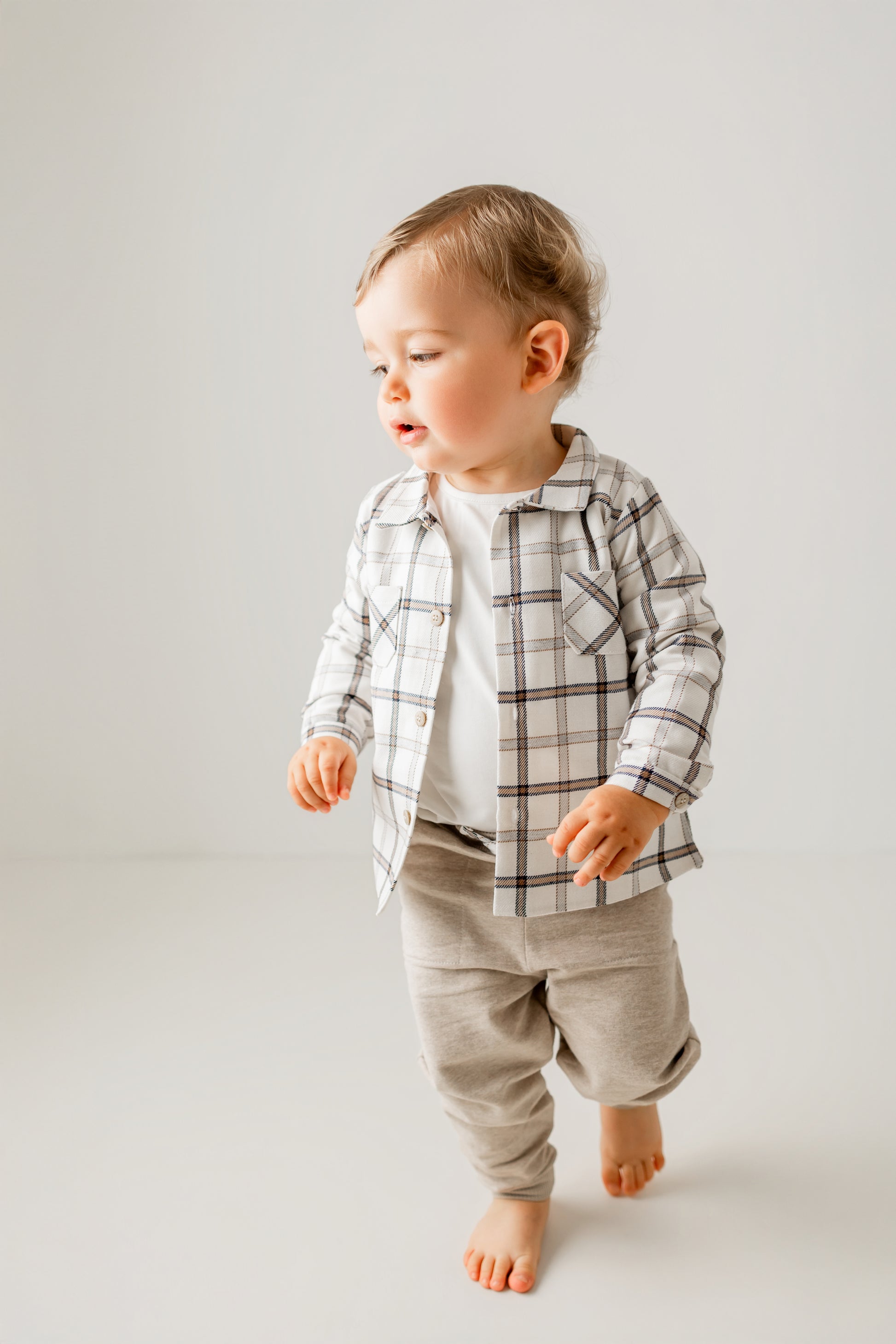 The PA302E Pastels Checked Overshirt features a crisp white base adorned with a beige and navy large checked pattern for a refined look. Designed with two front chest pockets, a smart collar, and button fastening, it offers versatile styling. Wear it buttoned up for a polished appearance or open over a t-shirt for a casual yet sophisticated layering option.