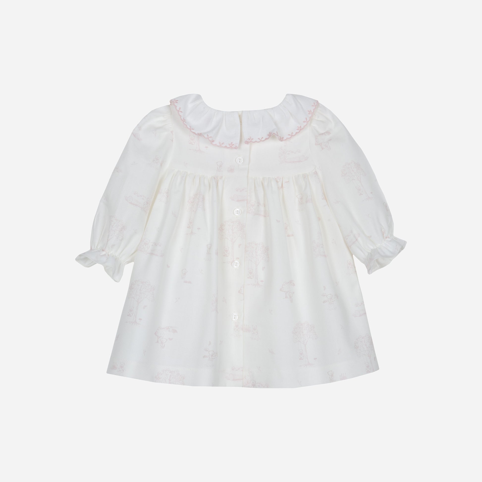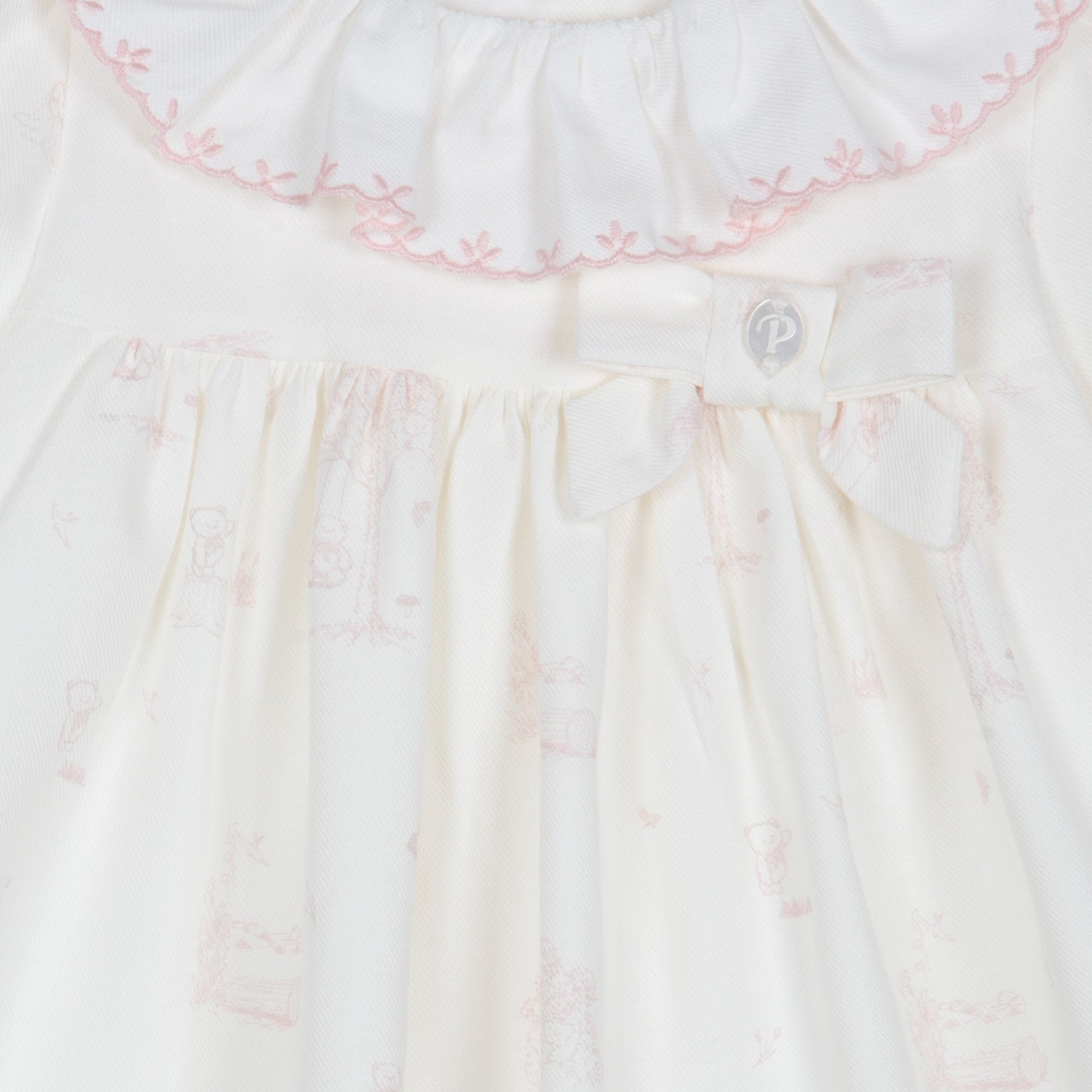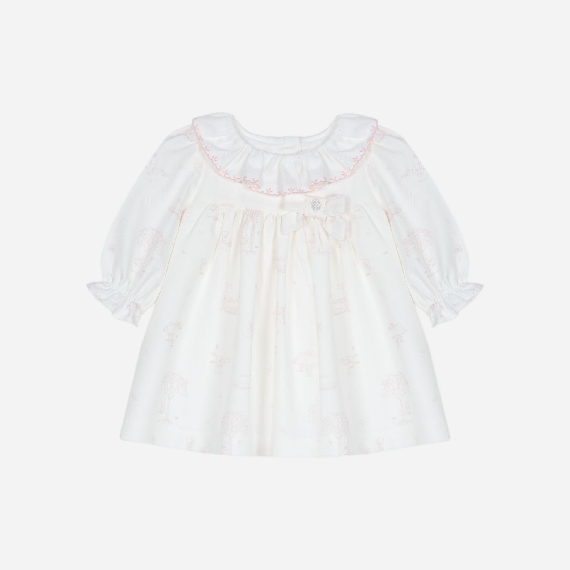 This Patachou classic baby dress features a timeless white design enhanced with a subtle pale pink teddy print throughout. It offers a delicate frilled round collar and an elegant bow detail at the front, combining style with softness. The long sleeves are finished with frill edges, adding a charming touch while ensuring your baby stays comfortable and cozy. Perfect for special occasions or everyday wear, this dress blends classic aesthetics with gentle detailing ideal for little ones.