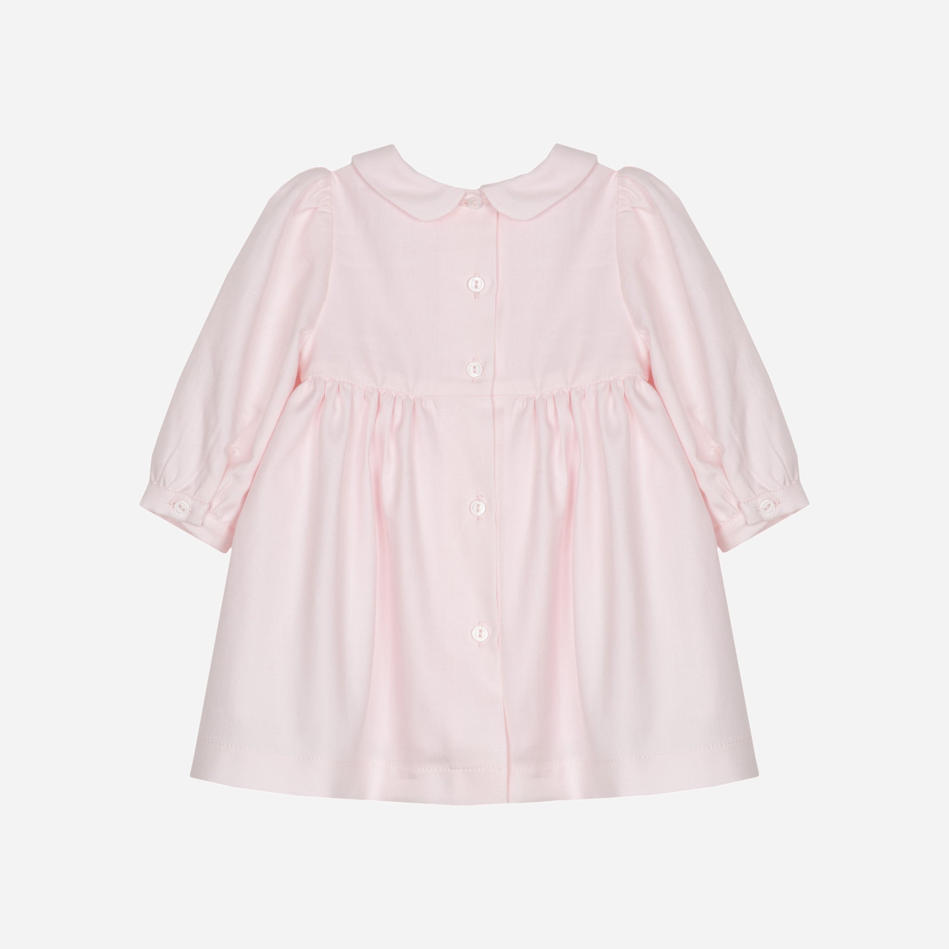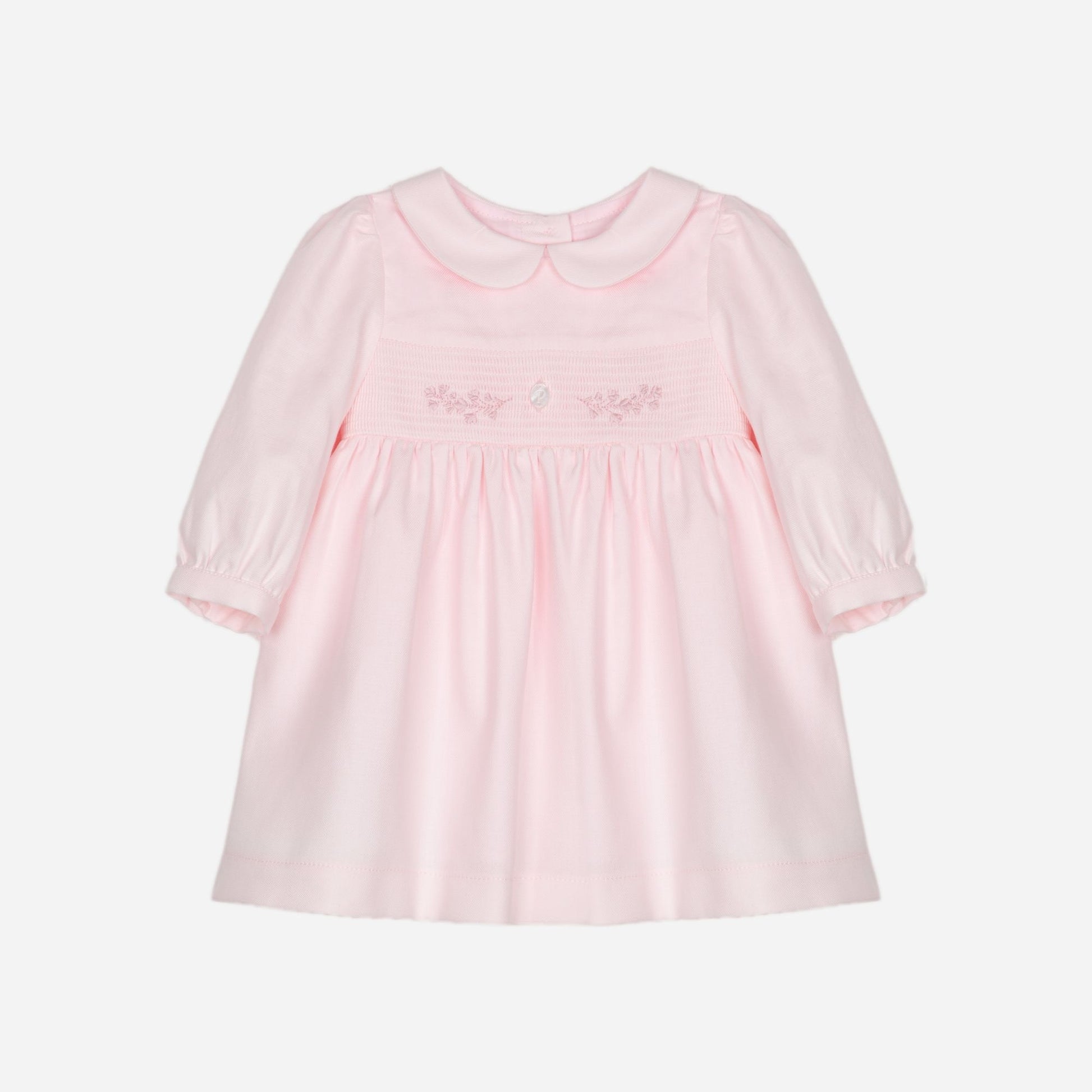 This classic dress features a full skirt and long sleeves, perfectly balanced by a delicate smocking detail on the chest adorned with charming floral embroidery. The round petal collar adds a refined, timeless touch, making it ideal for special occasions or elegant everyday wear. Crafted to combine comfort with sophistication, it ensures a graceful silhouette while allowing ease of movement.
