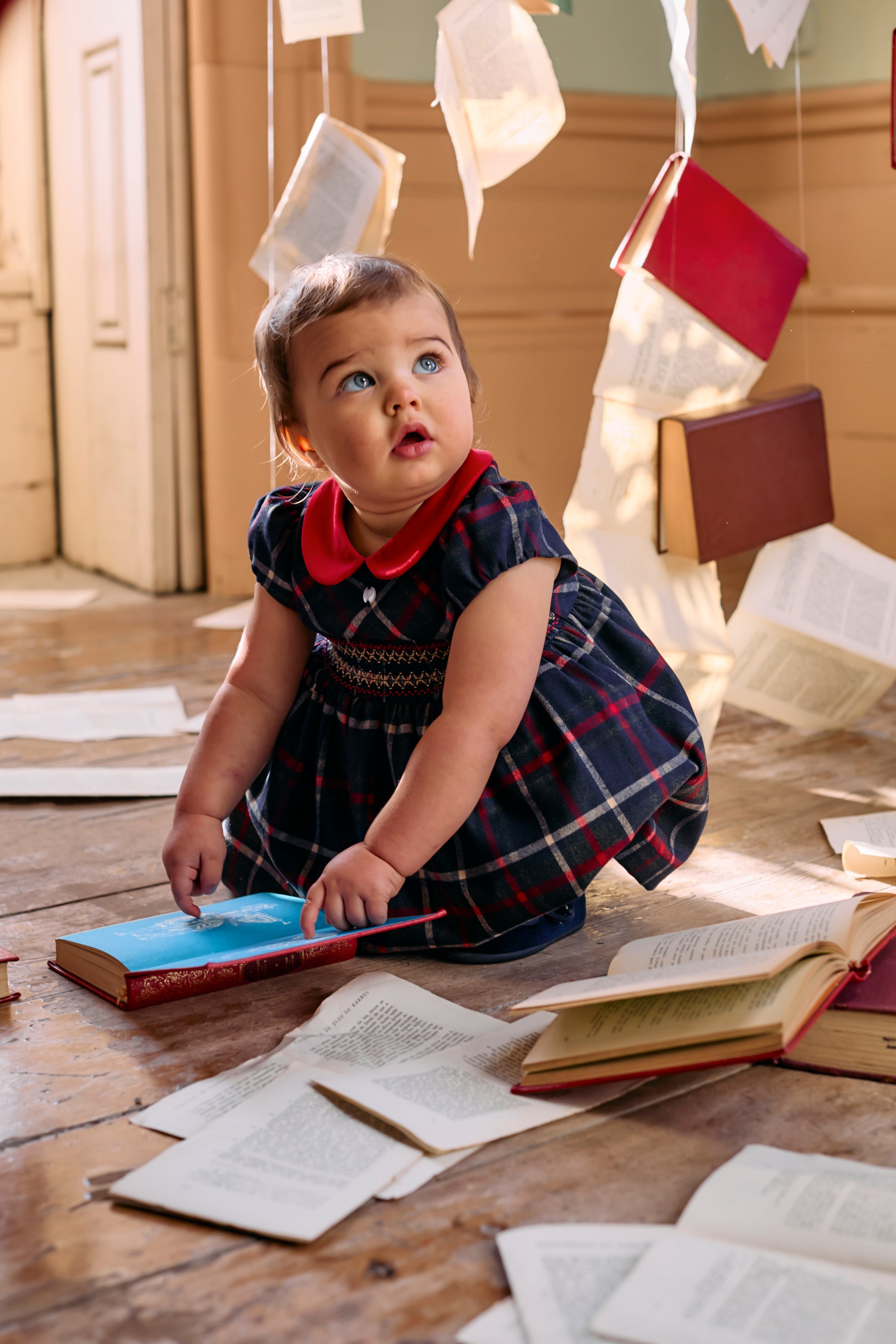 This navy and red tartan dress features a rich red velour collar and intricate red smocking detail across the chest, combining classic patterns with refined craftsmanship. An excellent choice for festive occasions, it offers a sophisticated yet comfortable style perfectly suited for holiday celebrations.