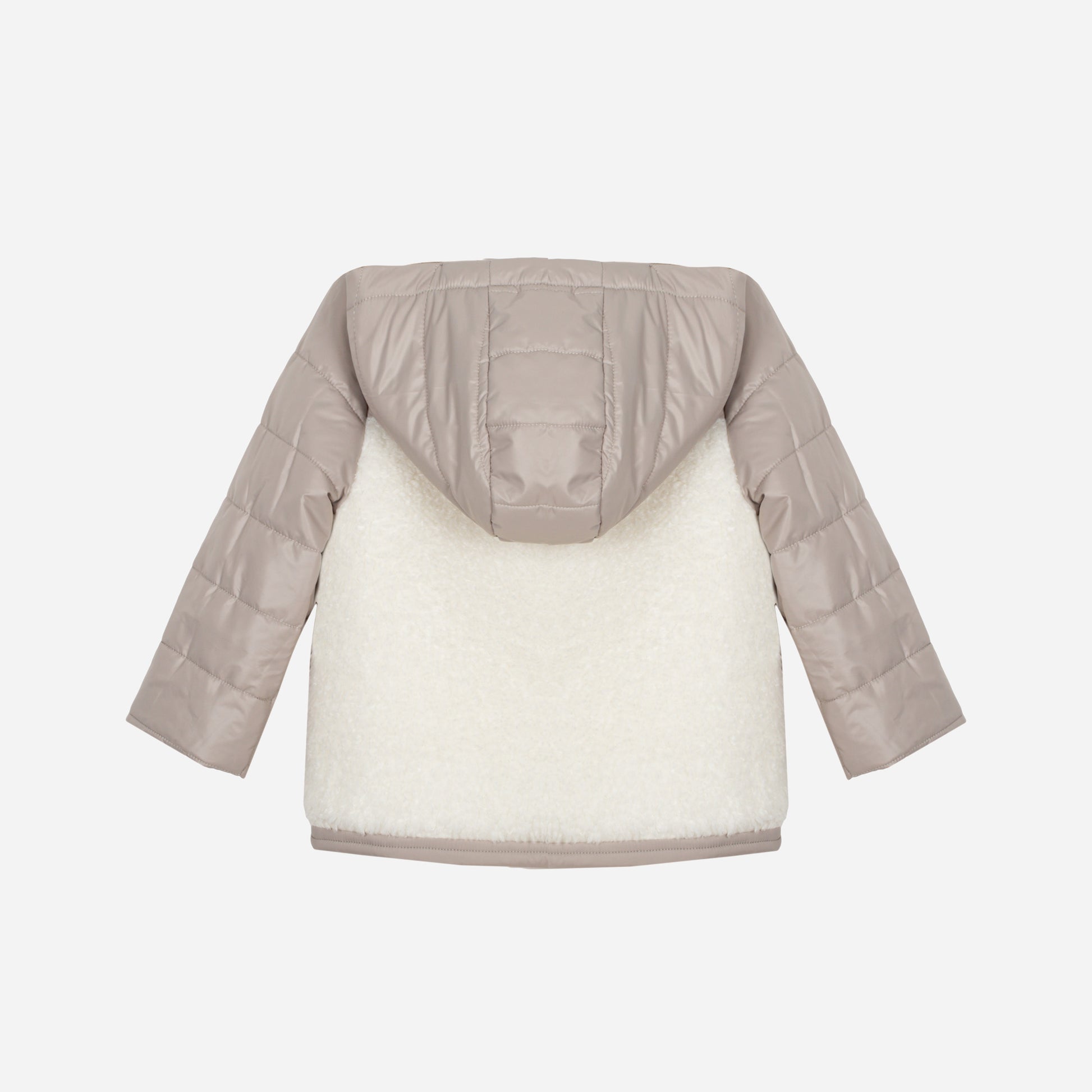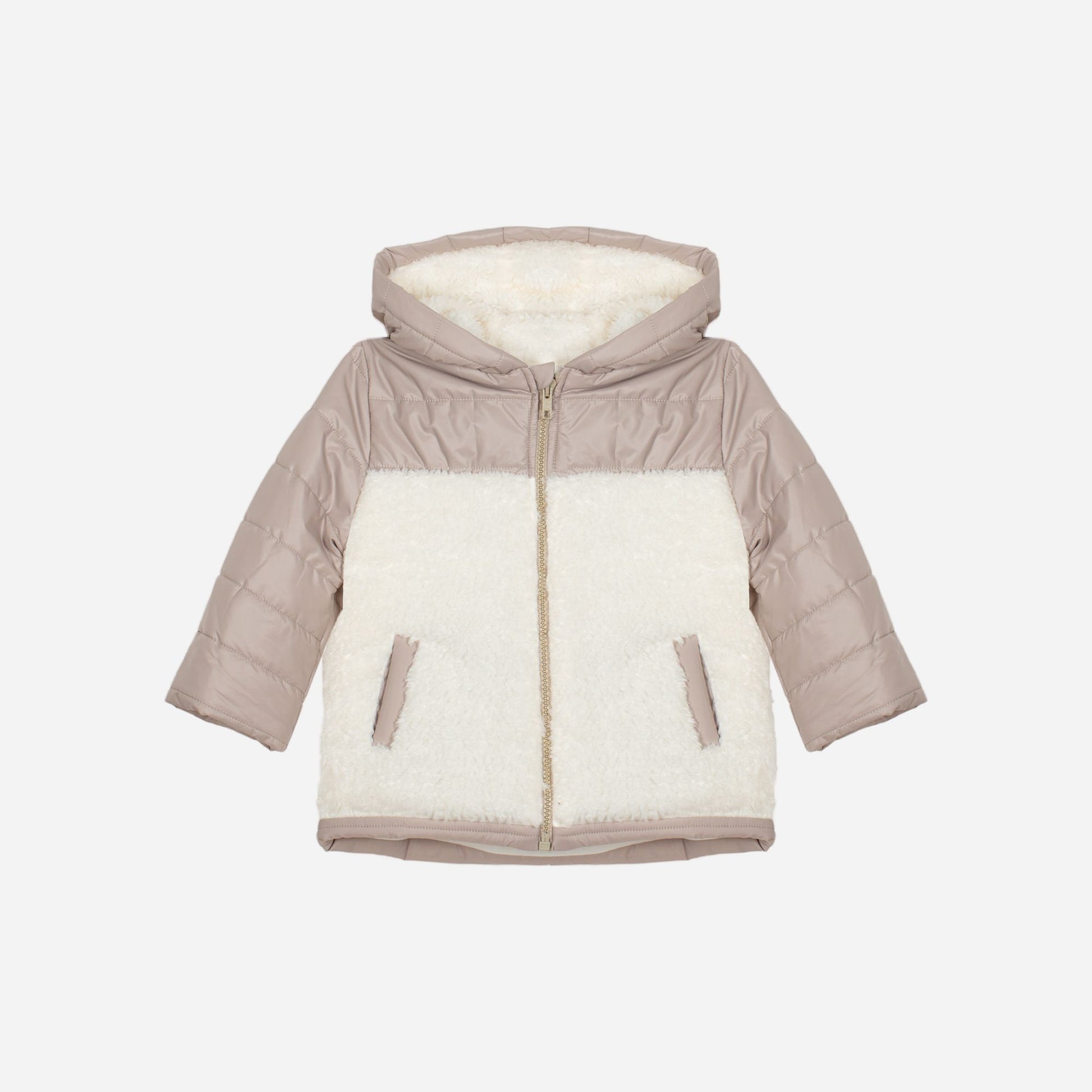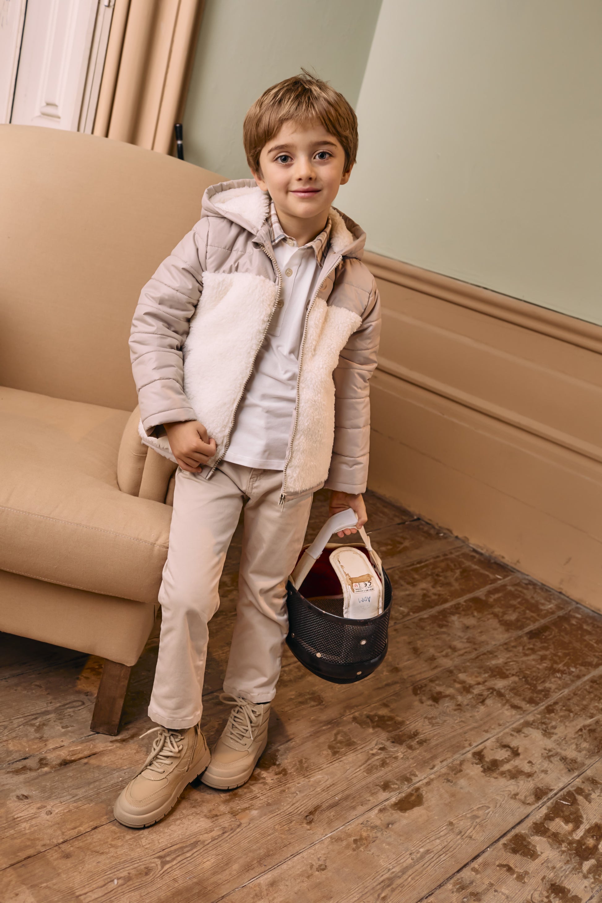 This two-tone cream and beige quilted jacket combines style and comfort effortlessly. The soft cream fleece interior provides warmth and a cozy feel, making it ideal for cooler days. Featuring a practical hood and front pockets, it offers both protection and convenient storage, perfect for everyday wear.