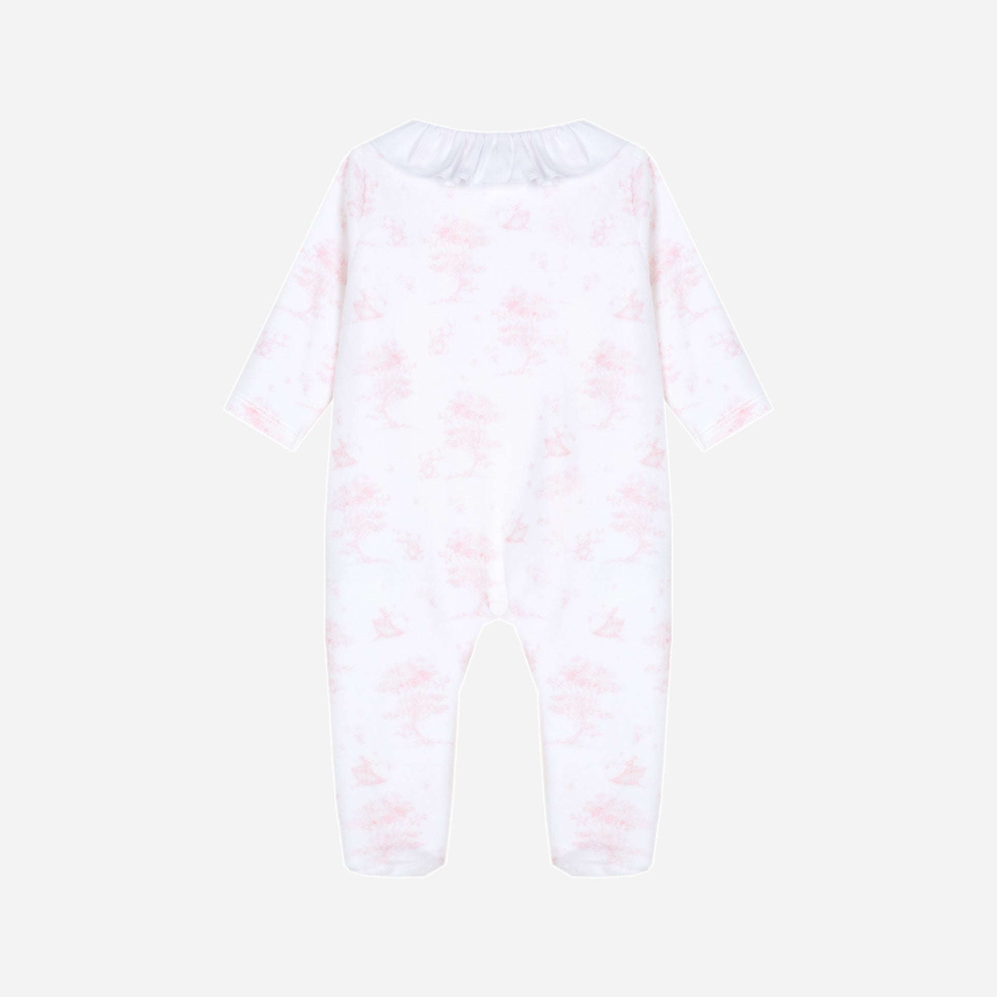 This Patachou Babygrow features a delicate floral pink pattern set against a crisp white background, perfectly crafted for comfort and style. Designed with a frilled round collar and long sleeves, it offers gentle coverage while the covered feet keep little toes warm. Ideal for everyday wear, this babygrow combines softness and elegance in one thoughtful design.