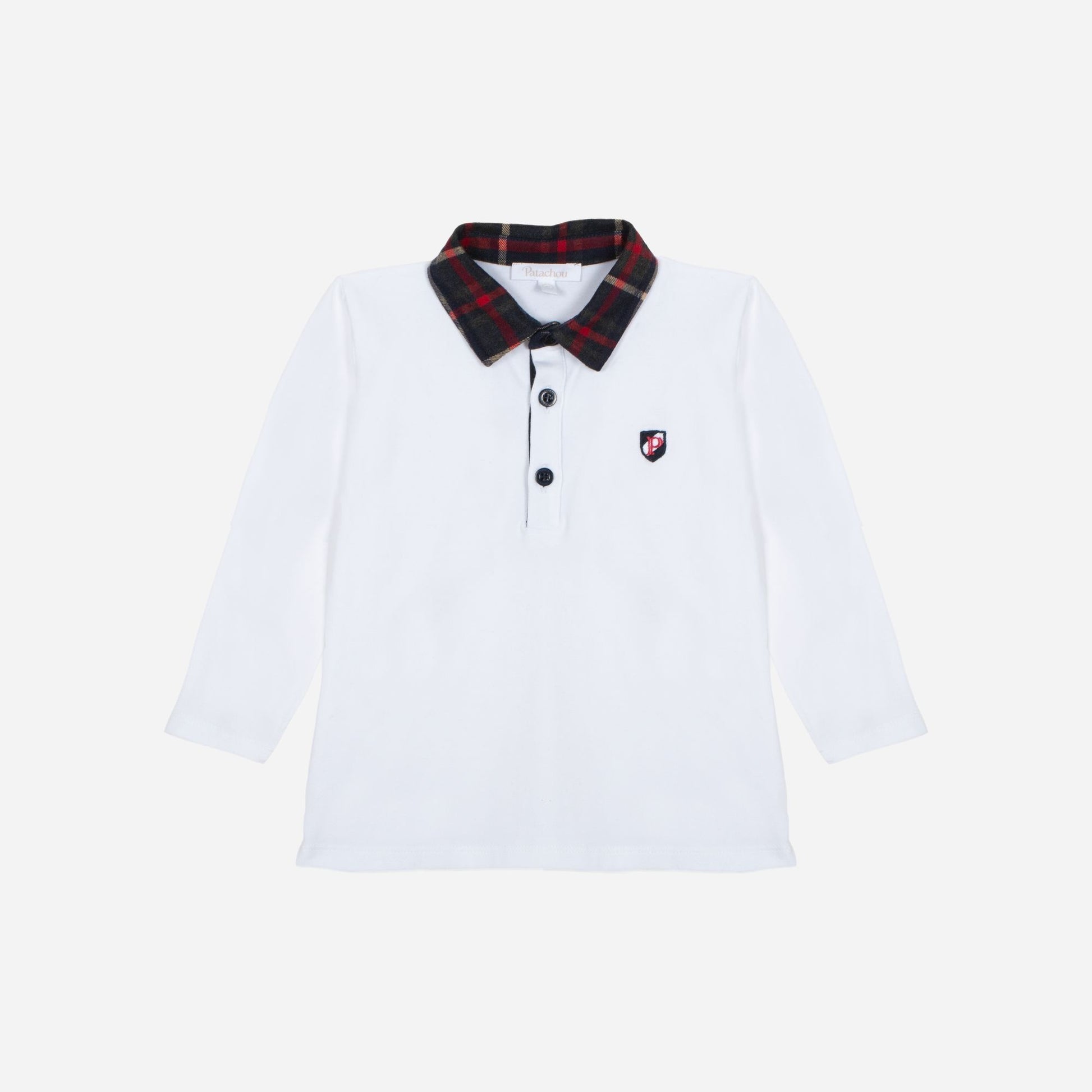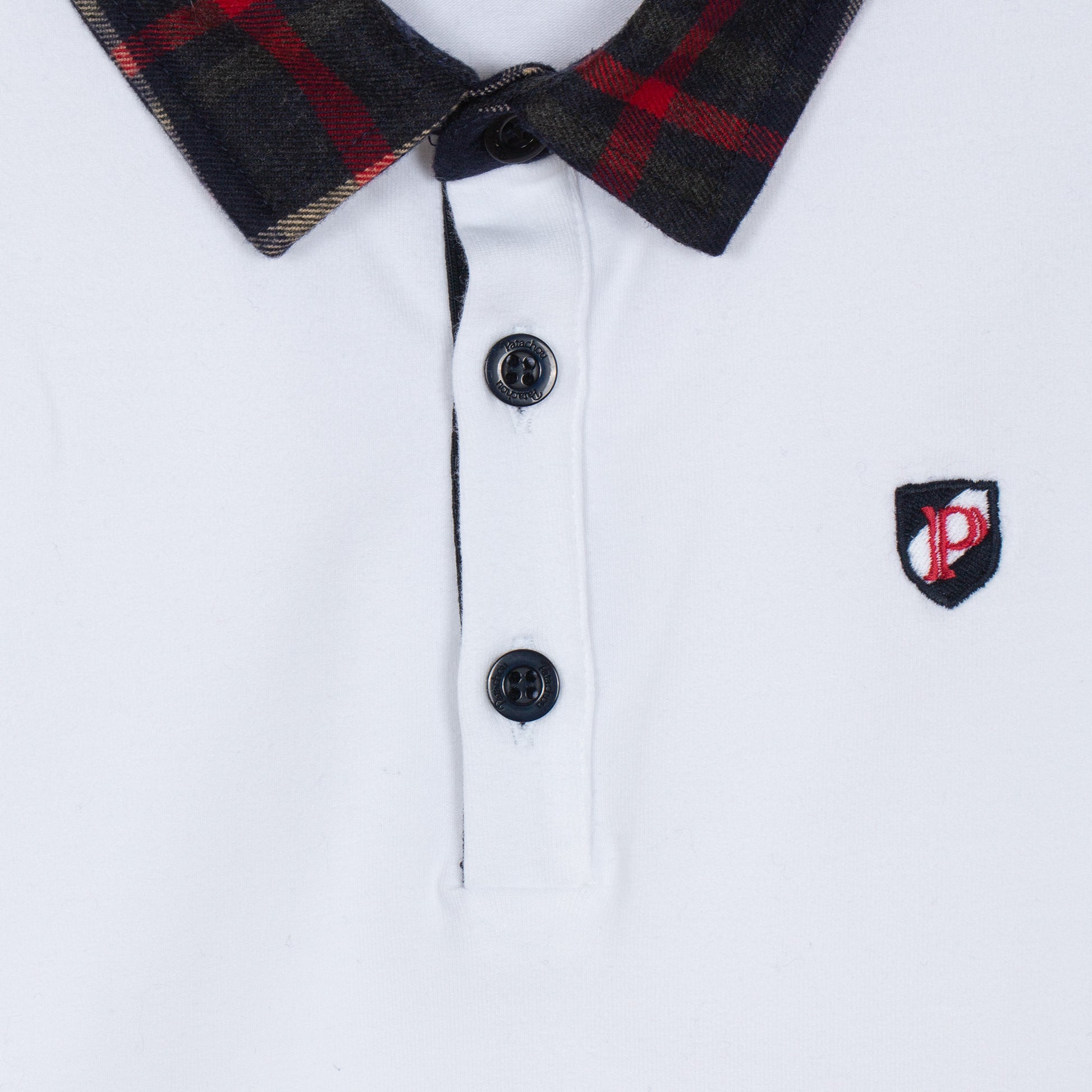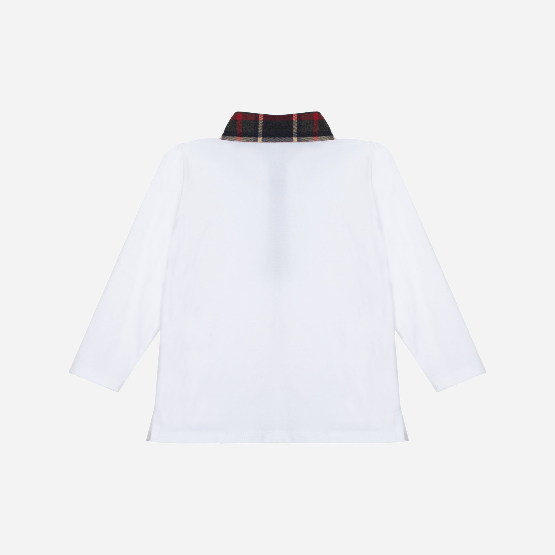 This long-sleeved white polo shirt combines classic style with refined details, featuring a distinctive tartan collar and matching placket accented by color-coordinated buttons. The small chest logo adds a subtle brand signature, making it perfect for smart-casual occasions where attention to detail matters. Designed for comfort and elegance, it’s an expert choice for elevating any wardrobe.